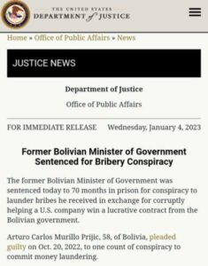 «El exministro de Gobierno de Bolivia fue sentenciado hoy a 70 meses de prisión por conspiración para lavar sobornos que recibió a cambio de ayudar de manera corrupta a una empresa estadounidense a ganar un lucrativo contrato con el gobierno boliviano», señala el comunicado oficial del Departamento de Justicia de Estados Unidos.
