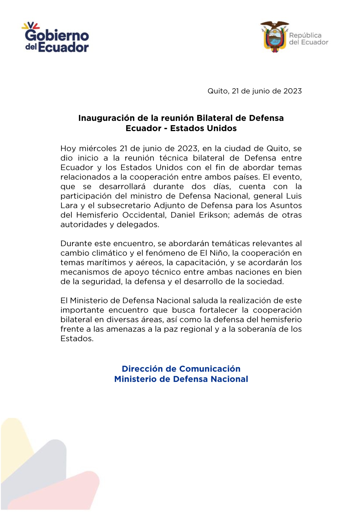 La firma del acuerdo se concretó el pasado 20 de junio, cuando el subsecretario adjunto de Defensa para el Hemisferio Occidental de Estados Unidos, Daniel Erikson, se reunió en Quito con el presidente de la República, Guillermo Lasso.