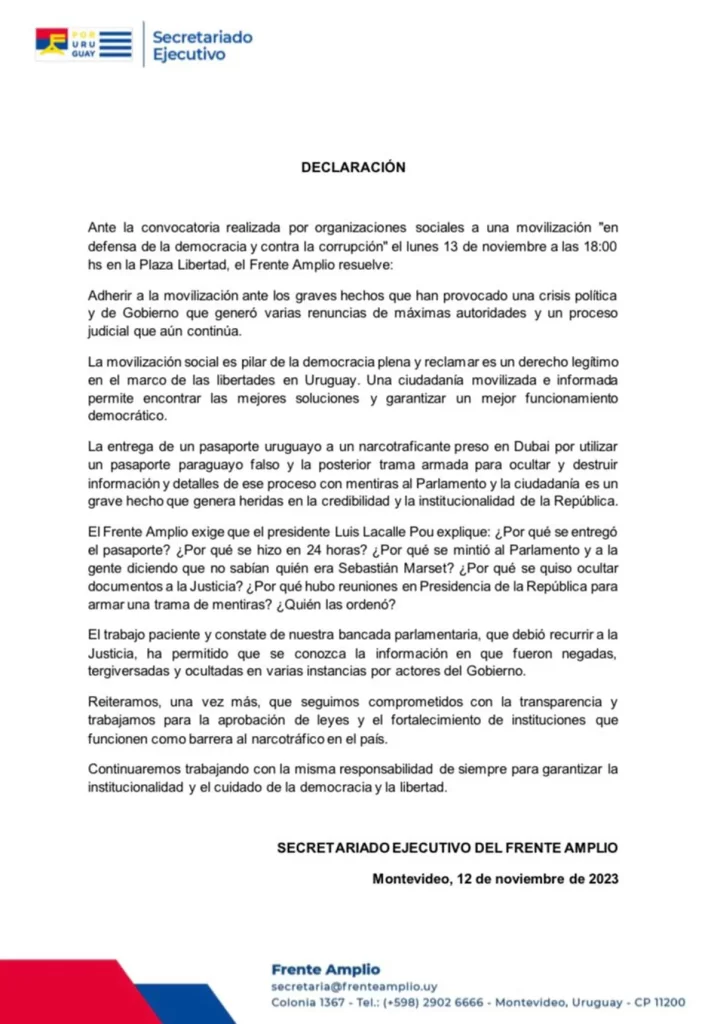 En otro pasaje del comunicado, la coalición de izquierda aseguró que la entrega del documento uruguayo al delincuente “es un grave hecho que genera heridas en la credibilidad y la institucionalidad de la República”.