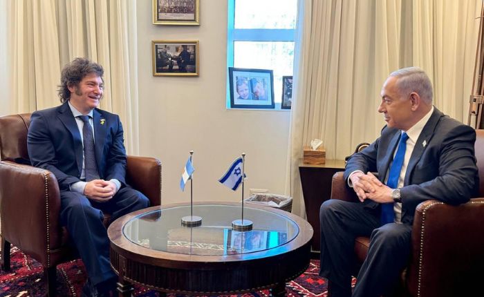 Netanyahu se reunió en su oficina, en Jerusalén, con el presidente argentino, primero en privado y luego en una reunión ampliada durante la cual el primer ministro agradeció a Milei su decisión de declarar a Hamas una organización terrorista y por su «apoyo inquebrantable» al derecho de Israel a defenderse.