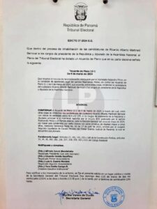 De esta forma se confirma el acuerdo 11-1 emitido por el TE el pasado 4 de marzo, en el que se inhabilitó a Martinelli para competir en las elecciones del próximo 5 de mayo, para los cargos de presidente de la República y diputado principal a la Asamblea Nacional por el circuito 8-4, postulado por RM y Alianza.