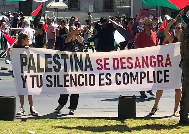 Palestina libre, soberana y sin ocupación sionista desde la tierra hasta el mar, fue una de las consignas que marcó el inicio de la marcha en Santiago. De ahí derivan las demandas concretas.