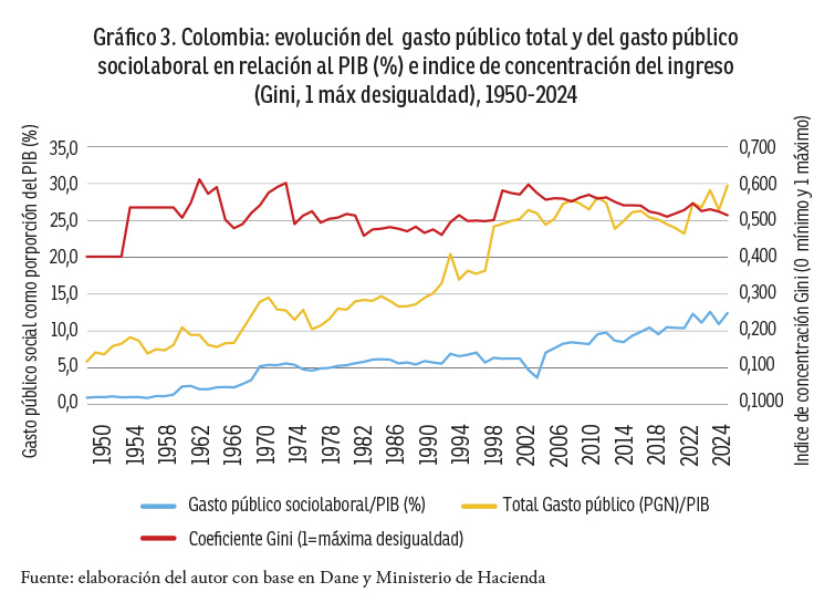 En Colombia, el gasto público total se expande más rápido que el gasto socio-laboral, en relación al PIB. En el período 1950-2024, la participación relativa del Presupuesto Público de la Nación respecto al PIB aumenta 23,8 puntos porcentuales y el gasto socio-laboral 11,4. El gasto en burocracia, mantenimiento y funcionamiento del Estado, el peso oneroso de la corrupción-impunidad, los gastos en los aparatos militares, de policía y de “justicia”, el apalancamiento del capital y la carga creciente y onerosa de la deuda pública explican, en parte, estas diferentes velocidades en los componentes del gasto público.