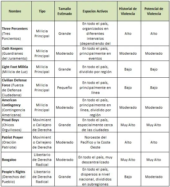 La presencia de milicias armadas como los Proud Boys, Oath Keepers y Three Percenters, han jugado un papel crucial en los disturbios y la movilización política desde las elecciones de 2020, promoviendo narrativas de fraude electoral y resistencia armada contra el gobierno federal.