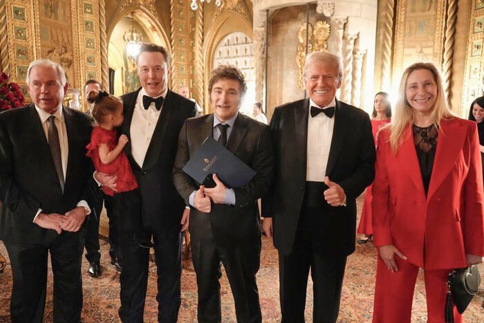 Milei justo al nuevo presidente de los Estados Unidos Donald Trump, Elon Musk y el nuevo canciller de la Argentina Gerardo Werthein y el Jefe Karina Milei. pic.twitter.com/Pub1ot1F4H