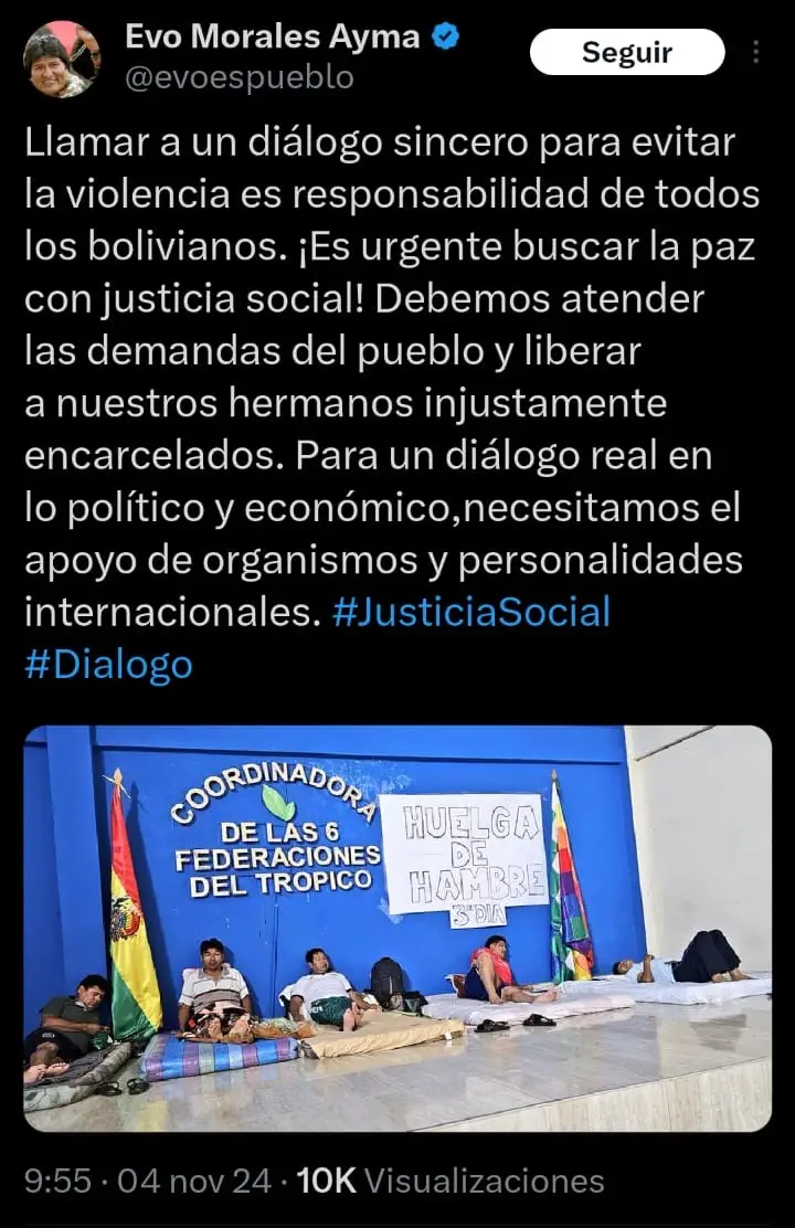 Morales instó al presidente del Estado, Luis Arce, “a sentarse en una mesa de diálogo, como recomiendan Naciones Unidas y otros organismos internacionales, para encontrar una salida pacífica a esta crisis”.