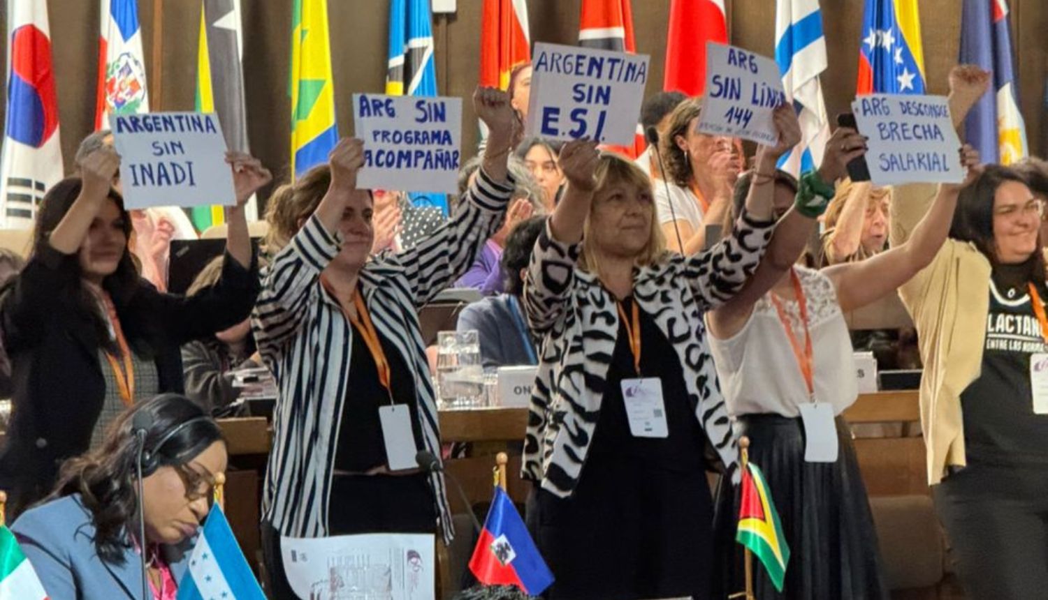 Feministas de Mendoza, La Pampa, Buenos aires y distintas provincias, así como organizaciones y redes se levantaron con carteles en la sala mostrando la perdida de derechos. La ovación y aplauso del resto de los países en el salón Previch fue acompañado de declaraciones expresas de numerosas delegaciones.