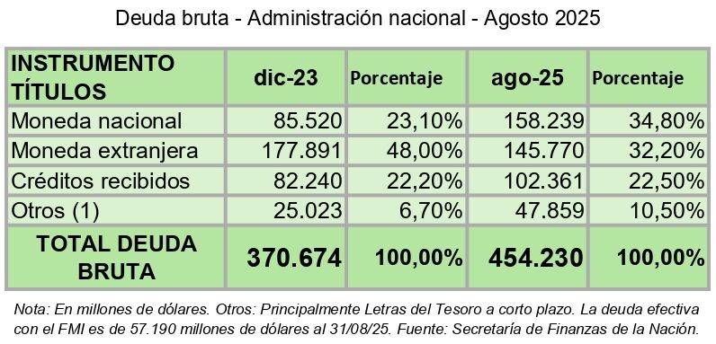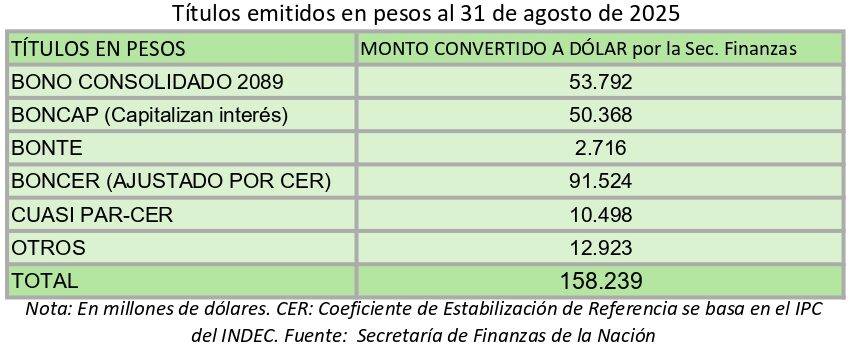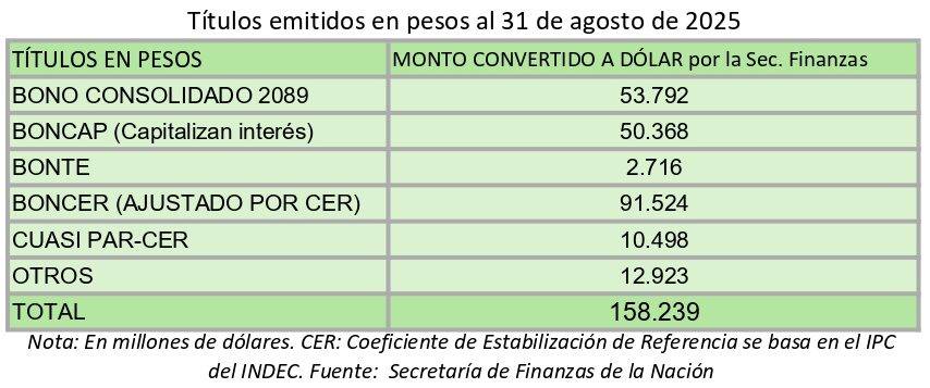 La deuda en pesos en los últimos tres meses del año asciende a 81 billones de pesos (equivalente a unos 53.000 millones de dólares). Para octubre hay, en total, vencimientos por 25 billones de pesos; para noviembre hay otros 20 billones, y en diciembre de 2025 suman 36 billones de pesos. Con la ventaja de que la mayor parte de la deuda que vence este año en pesos está en posesión de los bancos que operan en el país, quienes en la última licitación, la del viernes 26 de septiembre de 2025, cambiaron sus títulos ajustables por tasa TAMAR o por el IPC del INDEC, por títulos ajustados por dólar linked (precio oficial del dólar), que representó un 54% de lo colocado, mientras que el 46% restante fue con letras y bonos capitalizables a tasa fija a muy corto plazo.