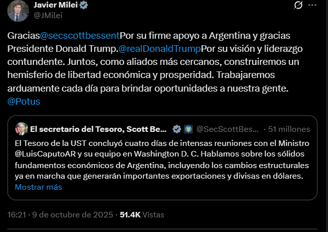 Además, Milei posteó: “Gracias Scott Bessent por su firme apoyo a Argentina, y gracias al presidente Donald Trump por su visión y liderazgo contundente”.