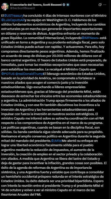 El secretario del Tesoro norteamericano, Scott Bessent anunció el acuerdo por el swap de 20 mil millones de dólares, y dijo que ya compraron pesos argentinos.  Lo comunicó con un mensaje a través de redes sociales, justo antes del regreso del ministro Caputo a la Argentina.
