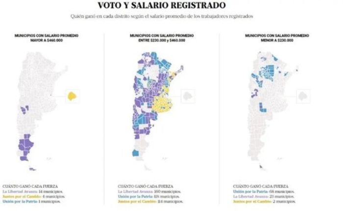 La gran novedad se registra en los municipios poblados de salarios medios bajos y medios vulnerables, donde el dominio de LLA es notable, incluso sobre UP y Juntos.