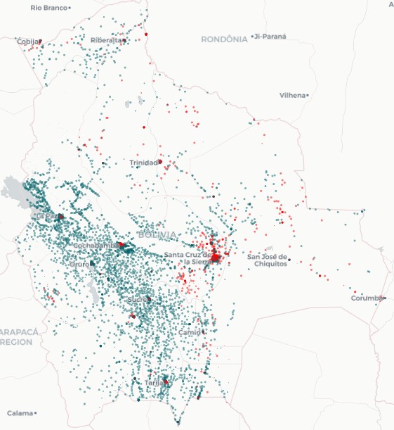 En contraposición, los votos que empujaron a Jorge “Tuto” Quiroga y Juan Pablo Velasco del 26.7% al 45.5% fueron mayoritariamente de las ciudades capitales, junto a un apoyo generalizado de los departamentos de Beni y Santa Cruz. Un voto principalmente de la clase media tradicional y sectores aspiracionales, predominante en el oriente del país, el histórico bastión de la derecha boliviana. Las gráficas a continuación nos muestran en general y en detalle esta geografía del voto.