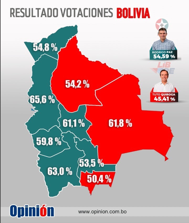 Un análisis a los datos muestra una victoria contundente del PDC en 6 de los 9 departamentos del país, 5 de ellos pertenecientes al occidente y en 4 de estos con una puntuación igual o mayor al 60%: La Paz, Potosí, Cochabamba y Oruro. En Bolivia, la geografía es determinante y la victoria del binomio en toda la zona altiplánica y valluna no es casual. El voto que hizo ganadores a Rodrigo Paz y Edman Lara es eminentemente indígena, tanto rural como urbano, y principalmente del occidente del país. Estas redes comunales y de economía popular votaron nuevamente en bloque, sumando a las victorias ya mencionadas otras igualmente importantes como las de Pando y Chuquisaca, e incluso una derrota por margen minimo en Tarija (PDC 49.6% y LIBRE 50.4%).
