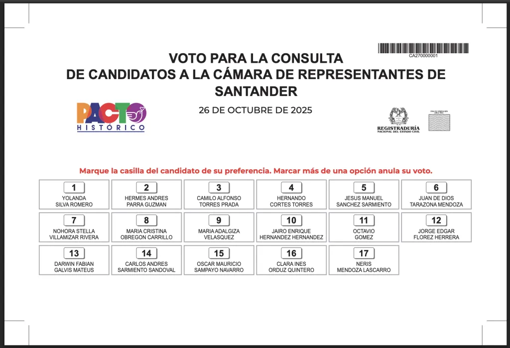 En cuanto al departamento de Santander, quienes decidan participar con su voto en la jornada electoral se encontrarán con un tarjetón con 17 nombres, de aspirantes a conformar la lista de candidatos a la Cámara de Representantes por el departamento, elecciones que se realizarán el 8 de marzo de 2026.