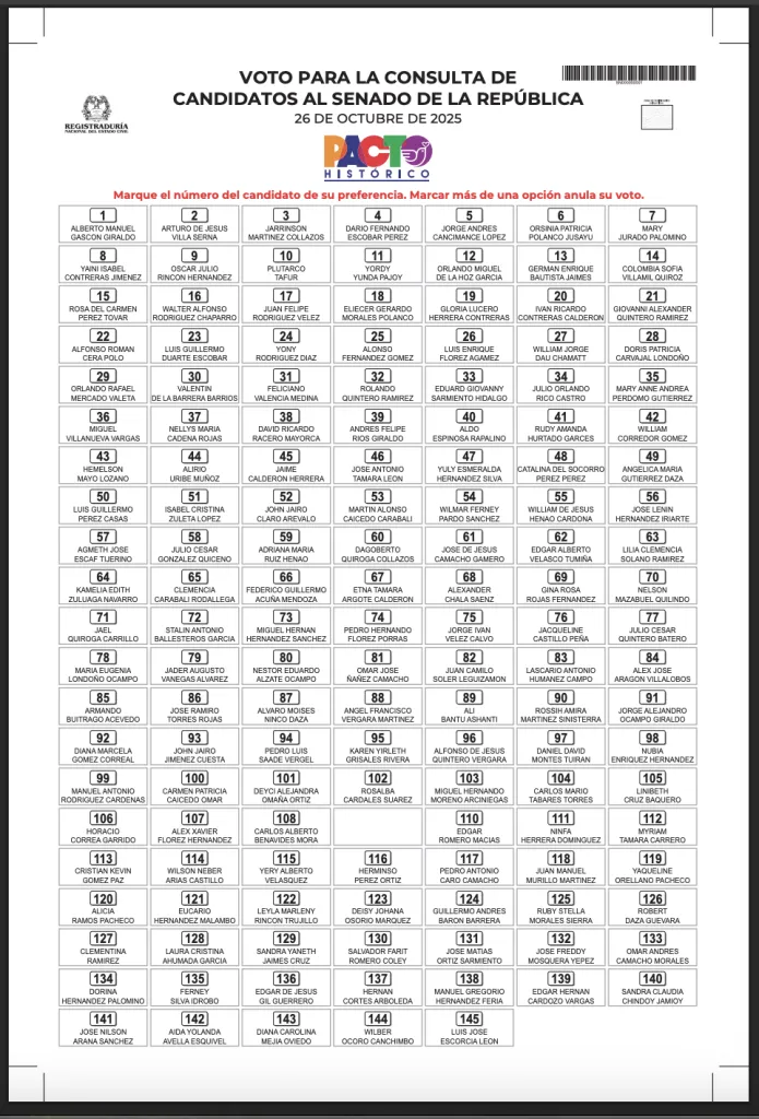 Entre tanto el tarjetón para escoger candidatos al Senado de la República que recibirán los ciudadanos que quieran participar en esta consulta del Pacto tendrá 144 aspirantes.