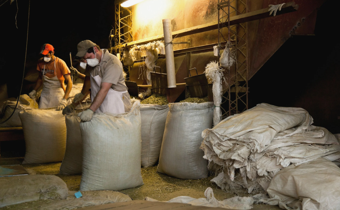 Empleados empaquetan yerba mate en grandes bolsas en una plantación de Misiones, Argentina. El país es actualmente el líder en superficie cultivada de yerba mate, mientras que los proyectos en Uruguay son en su mayoría de pequeña escala. Imagen: Jason Rothe / Alamy