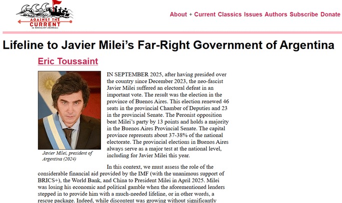“En las elecciones de octubre de 2023, Milei ganó las elecciones presidenciales presentándose como un salvador y utilizando métodos de comunicación similares a los de Trump. Recibió inmediatamente las felicitaciones del FMI. Las grandes empresas argentinas e internacionales se mostraron complacidas. Pero las medidas de choque que adoptó provocaron una caída del consumo y un aumento de la pobreza, y no lograron reactivar la economía. Las ya escasas reservas de divisas se redujeron aún más. Milei esperaba que su impopular política de austeridad y sus múltiples medidas de desregulación atrajeran una gran afluencia de capital extranjero. Esto no ocurrió.”