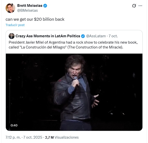 Mostrando el bochornoso video de Milei tratando de parecer un rockstar, el presentador Brett Meiselas le dijo en X a sus cinco millones de suscriptores en Youtube: “¿Podemos recuperar nuestros 20 mil millones de dólares?” (7 de octubre de 2025).