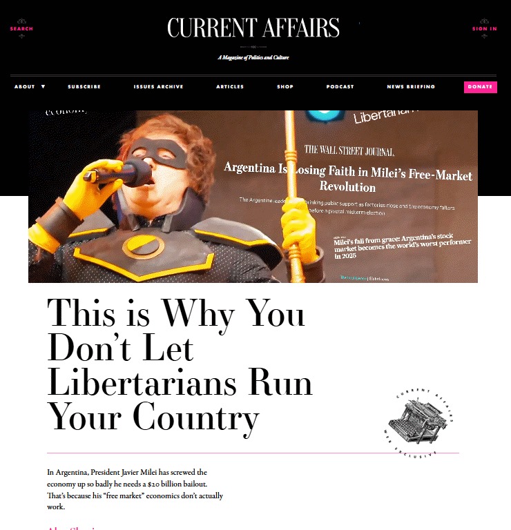 “Milei se hizo pasar por un forastero que podía hacer la cirugía de emergencia para arreglar su país; ahora está en deuda con las mismas instituciones que una vez despreció y depende para su apoyo de una potencia extranjera al norte y de las élites adineradas del país que se han adueñado de gran parte de la riqueza de Argentina.”