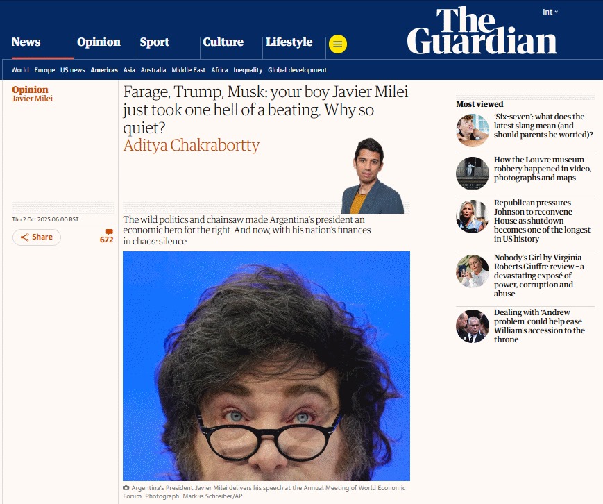 “Trump se adentra en la política de rescates financieros al ofrecer un salvavidas a Argentina. […] El control del populista asediado se debilita a medida que la ayuda estadounidense expone su vulnerabilidad a la extorsión, en un intento desesperado por salvar su régimen en ruinas.”
