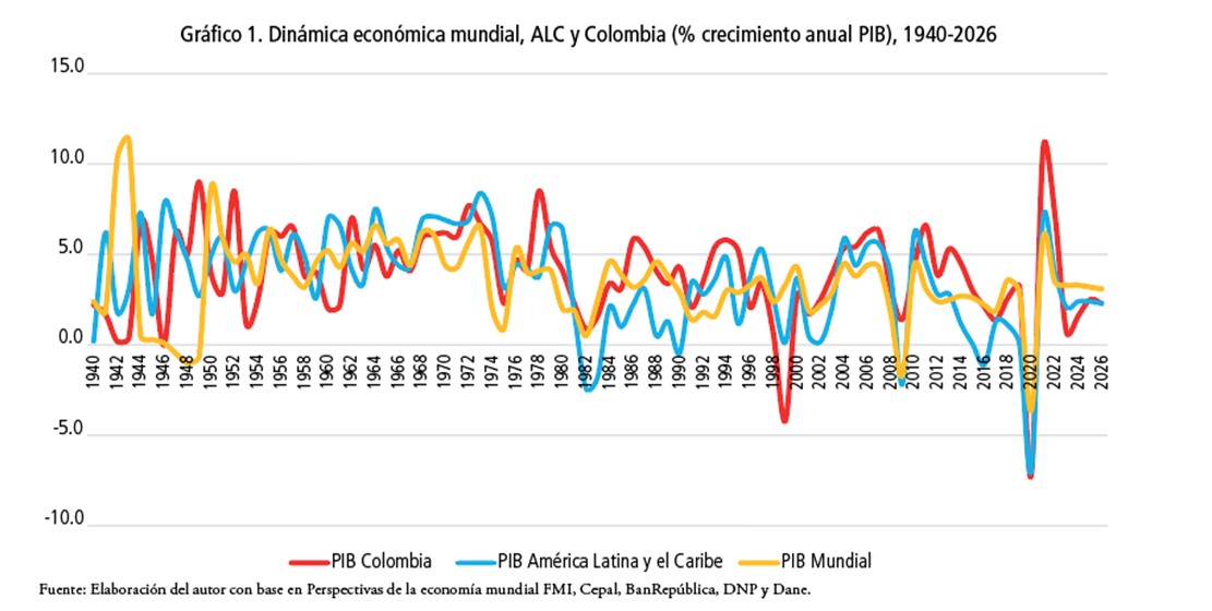 - La correlación3de la dinámica mundial total en el período 1940-2026 es de 0,4014 respecto al conjunto de los 33 países que integran América Latina y el Caribe (ALC) y de 0,2361 con la evolución de la economía de Colombia. La asociación entre los cambios históricos del PIB de ALC y Colombia es de 0,5599;
