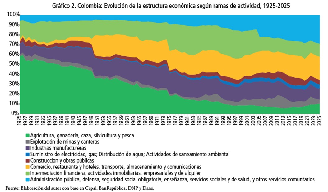 Para el año en curso, el sector primario de la economía contribuye con el 14,6 por ciento del PIB; el sector secundario aporta el 19,9 por ciento del valor agregado anual; las actividades terciarias concentran dos terceras partes de la economía. La estructura productiva moldea la oferta y demanda de trabajo en el mercado laboral; la fuerza de trabajo colombiana ocupada se distribuye de la siguiente forma, de acuerdo con los resultados de la Geih del mes de septiembre de 2025: 15 por ciento, sector primario; 19,3 en las ramas de actividad secundarias (“Industrias manufactureras”, “Suministro de electricidad, gas y agua”, y “Construcción y obras públicas”); y 65,7 por ciento de los trabajadores se concentran en las actividades terciarias.
