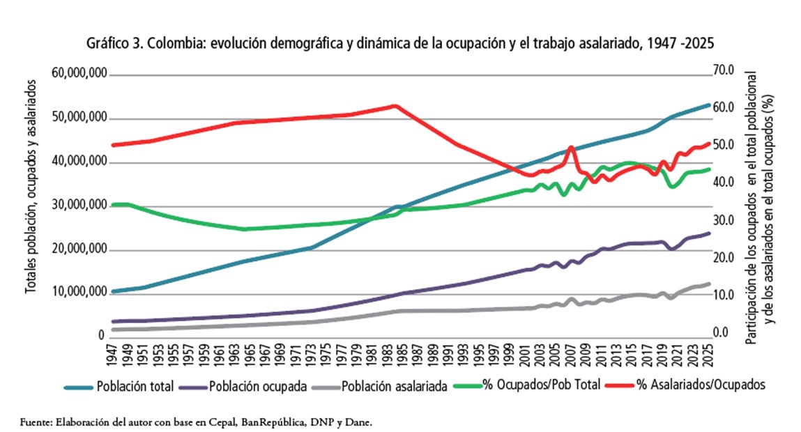 Para este sector ha sido diseñada toda la estructura de reglamentación económico-legales (laborales, tributarias, seguridad social, etc.) que rige actualmente. Al sector formal pertenece el empleo asalariado. En el período 1947-2025, el número total de población ocupada asalariada se multiplicó por 6,4 veces: dos millones en 1947 y 12,4 millones en 2025; en relación con la población ocupada, el promedio de participación de los trabajadores asalariados es de 52,4 por ciento; la tasa de incidencia del trabajo asalariado alcanza su mayor nivel durante el período de apogeo de la industrialización colombiana: entre mediados de las décadas de 1960 y 1980 con valores entre 58 y 62 por ciento respecto al total de la población ocupada. En los años 2024 y 2025, el trabajo asalariado aumentó de 50,8 a 51,8 por ciento.