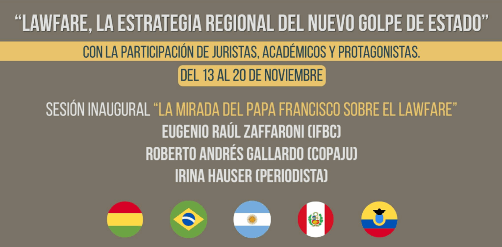 Del 13 al 20 de noviembre Seis encuentros para pensar al lawfare como “estrategia regional del nuevo golpe de Estado” Juristas, académicos y protagonistas abordarán casos emblemáticos en Argentina, Bolivia, Brasil, Ecuador y Perú de esta práctica de desestabilización institucional. Jornadas internacionales del Instituto Fray Bartolomé de las Casas (IFBC). CABA, 10/11.- Ante el avance … Sigue leyendo Encuentros para pensar al lawfare como “estrategia regional del nuevo golpe de Estado” en América Latina
