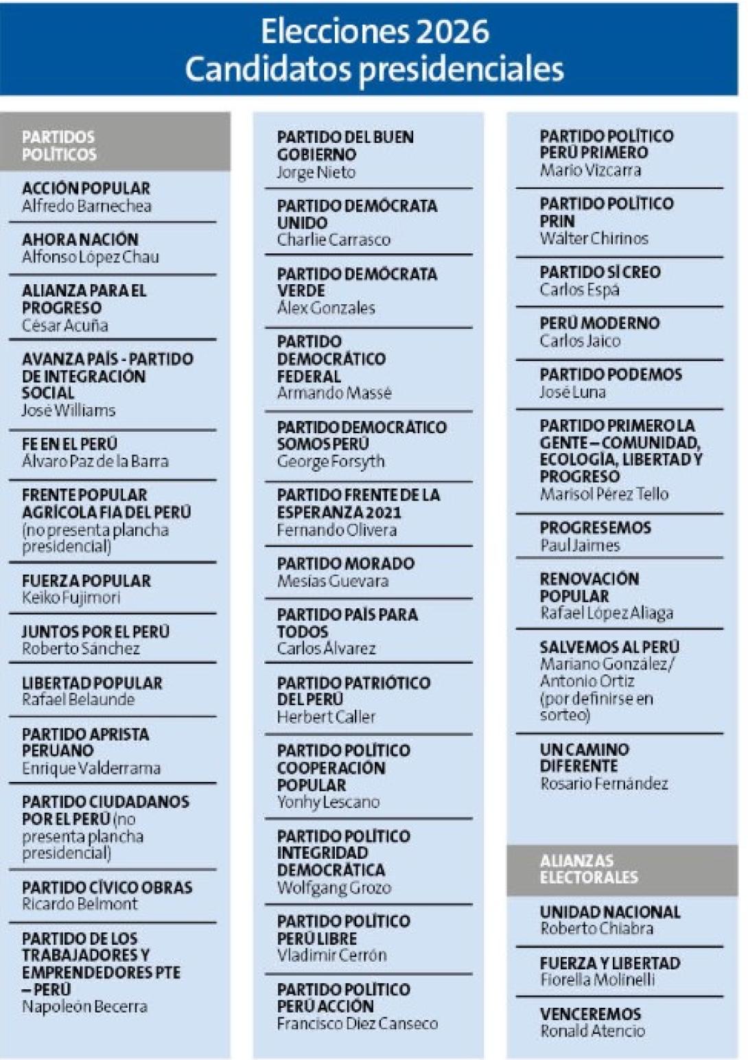 Las únicas agrupaciones que no participaron en los comicios de ayer fueron el Apra y Renovación Popular, tanto para la plancha presidencial como para el Congreso y el Parlamento, porque sus elecciones internas definieron el domingo 30 de noviembre y sus resultados quedaron oleados y sacramentados en esa jornada.