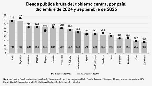La deuda pública de los gobiernos de América Latina es elevada, hasta septiembre de 2025 representó 51.8 por ciento del producto interno bruto (PIB), una ligera variación respecto al 51.5 por ciento registrado en 2024.