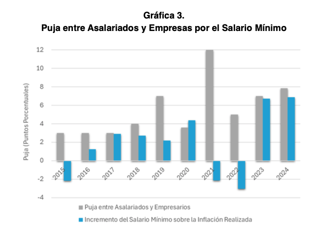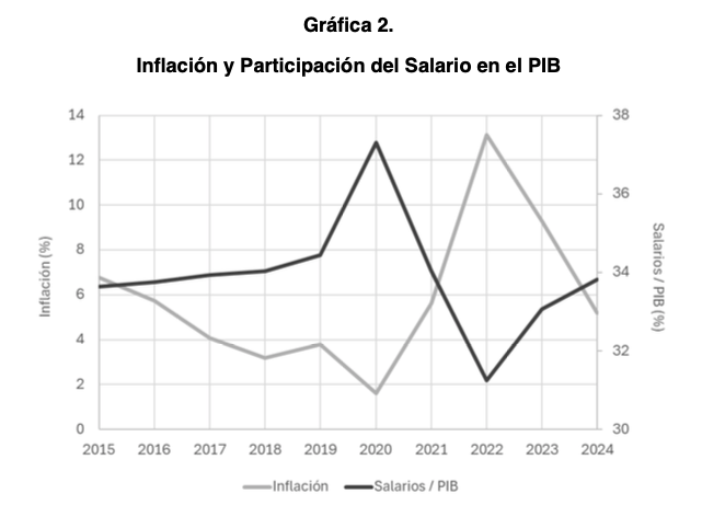 - El reconocimiento de solo la inflación en el ajuste del salario mínimo va reduciendo la participación de los salarios en el PIB. Un aumento que reconozca inflación y la productividad (como se calcula en el modelo neoclásico) solo contribuye a mantener constante dicha participación.