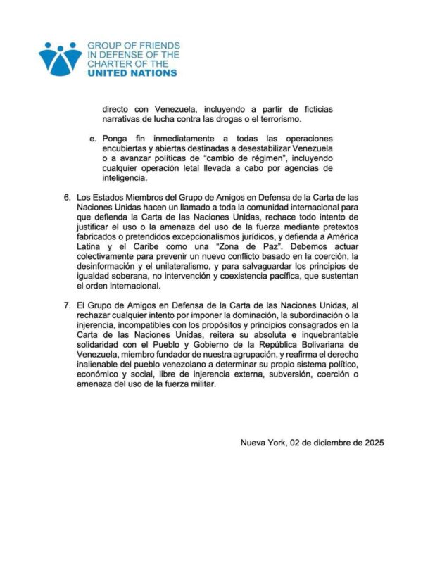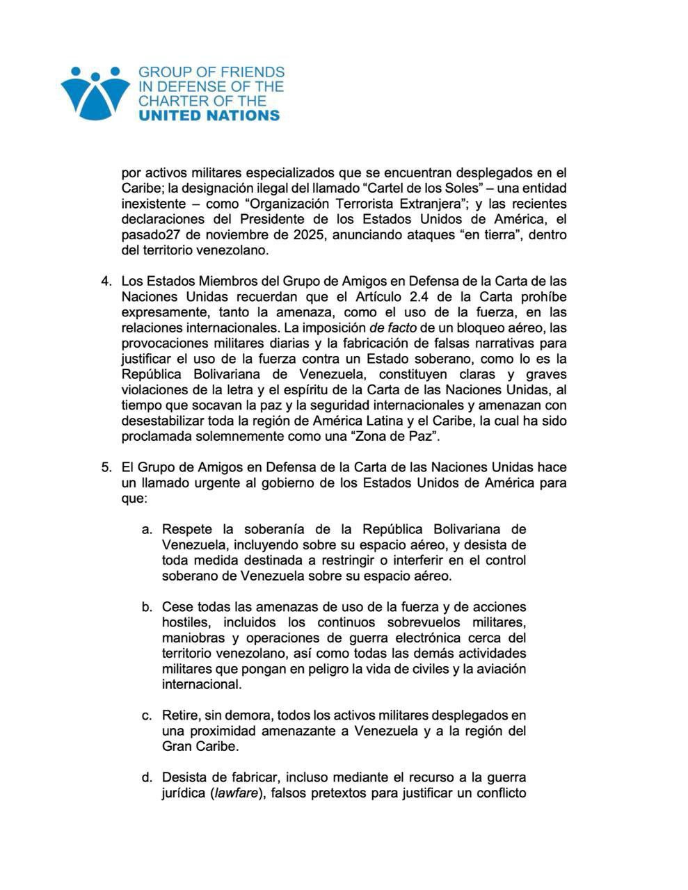 El Grupo de Amigos en Defensa de la Carta de las Naciones Unidas expresó su preocupación ante la grave y sin precedentes escalada de acciones hostiles y declaraciones amenazantes por parte del gobierno de los Estados Unidos de América contra la República Bolivariana de Venezuela.