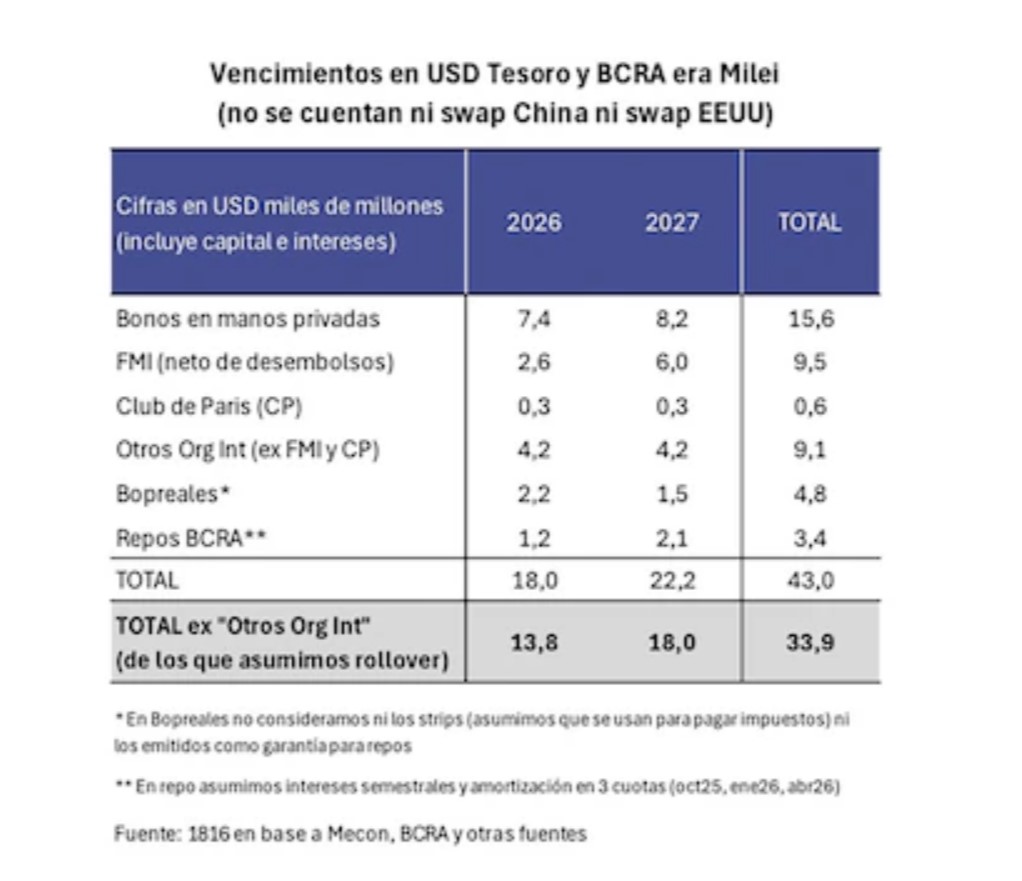 A este cuadro se suma el calendario de pagos con el FMI, que durante 2026 obliga al país a afrontar pagos netos por alrededor de USD 2.600 millones al organismo, además de los compromisos con bonistas privados, el Club de París, otros organismos internacionales, Bopreales y los propios préstamos REPO del BCRA. En total, el año concentra vencimientos por cerca de USD 19.500 millones, en un contexto de déficit estructural de divisas.