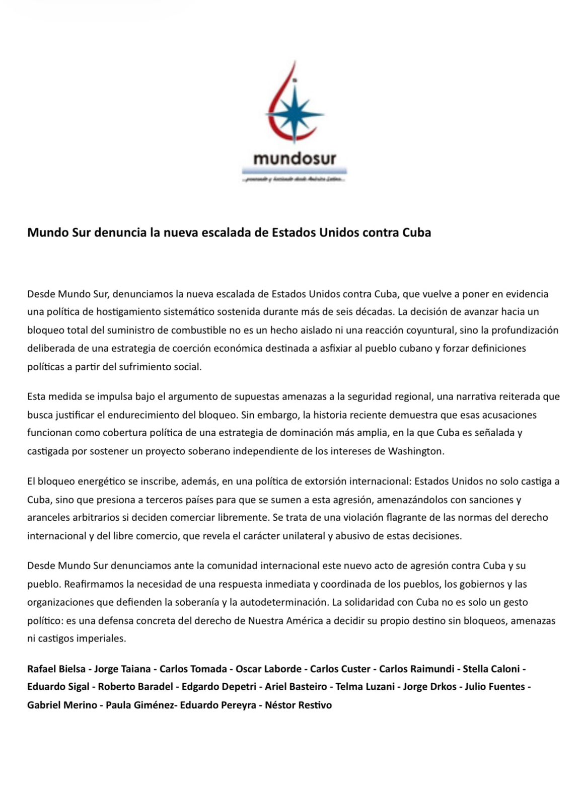 El comunicado concluye con un llamado a los gobiernos, organizaciones sociales y pueblos del mundo a articular una respuesta política y diplomática frente a la escalada. En ese marco, se plantea que la solidaridad con Cuba trasciende el plano simbólico y constituye una defensa concreta del derecho de los países latinoamericanos y caribeños a definir su propio destino sin presiones externas.