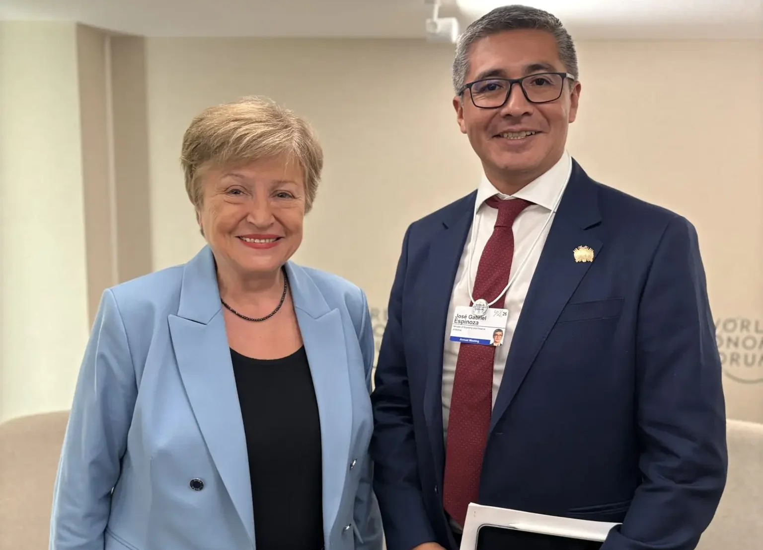 A través de sus redes sociales, Georgieva destacó el alcance de las políticas impulsadas por el país y el compromiso del FMI de acompañar este proceso. “Tuve una conversación enriquecedora con José Gabriel Espinoza sobre los impresionantes esfuerzos del gobierno boliviano para mejorar las condiciones de vida de todos los bolivianos en el Foro de Davos. El FMI apoyará este esfuerzo histórico en cada paso del camino”, señaló la máxima autoridad del organismo internacional.