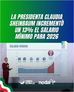 Uno de los pilares de este proceso es la política de recuperación del salario mínimo. El Secretario del Trabajo y Previsión Social, Marath Bolaños, anunció un incremento del 13 % para 2026, que eleva el salario mínimo diario de 278,80 a 315,04 pesos a partir del 1 de enero. Esta medida se inscribe en una política distributiva sostenida, ya que desde 2018 a la fecha, el salario mínimo acumuló un aumento del 154 %. Bolaños remarcó que “se trata del nivel más alto que se ha tenido registro del salario desde el año 180” y pone fin a un proceso de precarización salarial iniciado con el neoliberalismo.