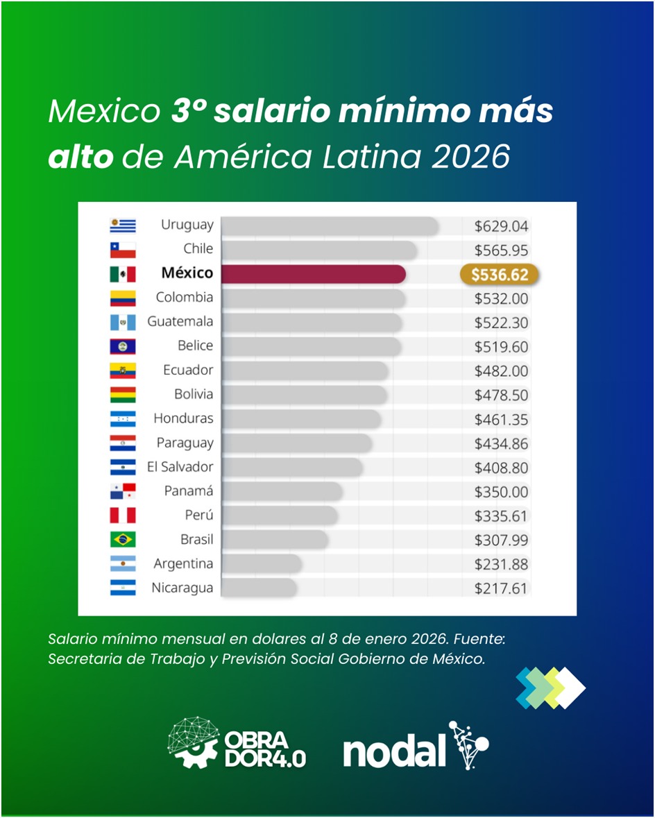 En términos regionales, el salario mínimo mexicano se ubica como el tercero más alto de América Latina medido en dólares, con un ingreso mensual estimado de 536,62 dólares, solo por detrás de Uruguay y Chile. Muy por debajo quedan países como Nicaragua (217,61 dólares) y Argentina (231,61 dólares), que hoy registran algunos de los valores más bajos de la región.