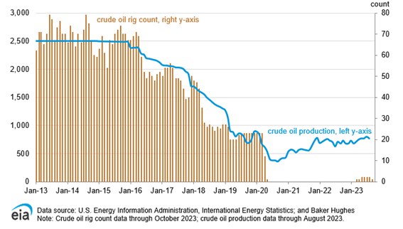 Figura 2: Producción de petróleo en Venezuela periodo 2013-2023. Fuente: eia (2023).