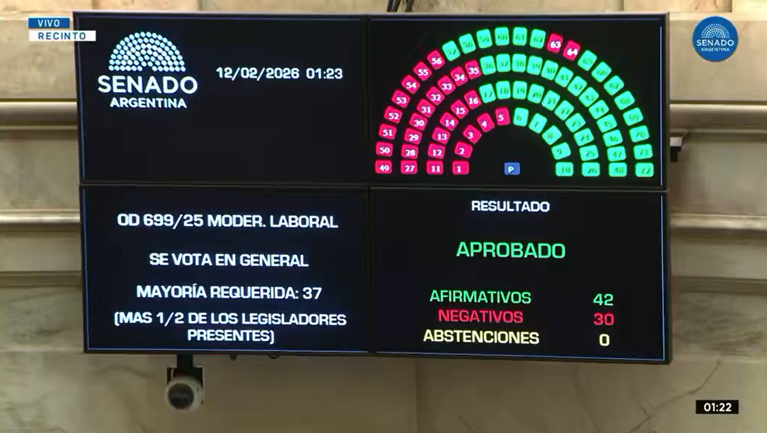 La reforma contó con el apoyo de 42 senadores compuestos por la Libertad Avanza (LLA) y sus aliados del PRO, la Unión Cívica Radical (UCR) y partidos provinciales. Se realizaron 28 cambios a la propuesta enviada por el Gobierno como resultado de negociaciones con el sector empresario y sindical. En el gobierno dicen que en Diputados buscarán dictaminar la próxima semana para aprobar antes del cierre de sesiones extraordinarias.
