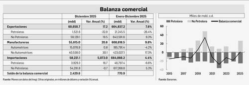 La balanza comercial presentó un superávit de 771 millones de dólares, frente al déficit de 18 mil 541 millones observado en 2024. El alza del saldo en el periodo de referencia resultó de un mayor superávit de la balanza de productos no petroleros –que pasó de 2 mil 686 millones de dólares, en 2024, a 26 mil 323 millones, en 2025–, y de un aumento del déficit de la balanza de productos petroleros, que pasó de 21 mil 226 millones a 25 mil 552 millones de dólares, en esa misma comparación.