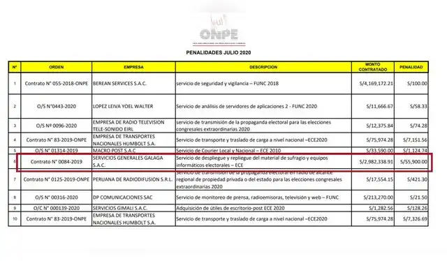 ONPE le impuso más de S/64.000 en penalidades a Galaga