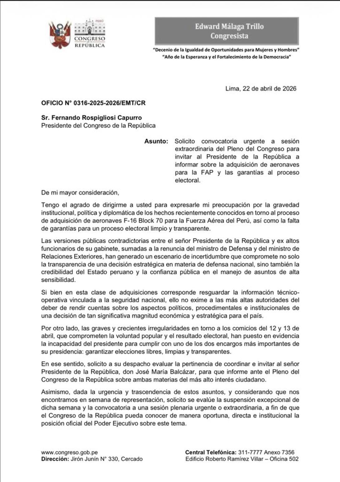 Málaga Trillo fundamentó su pedido de un Pleno Extraordinario en lo que considera una falta de capacidad del presidente José María Balcázar para conducir el país. Según dijo a Perú21 el legislador señaló que el mandatario ha fallado en su tarea principal de garantizar la transparencia electoral y ha generado inestabilidad internacional con el manejo de la compra de los aviones F-16.